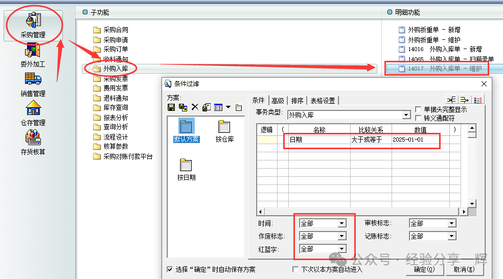 查询时新手们要注意一个点,红蓝字这里要选(全部),之前我查退货单据时老是查询不到,后面才知道是因为这里选了(蓝色),所以用什么条件来查都查不到退货的单据。