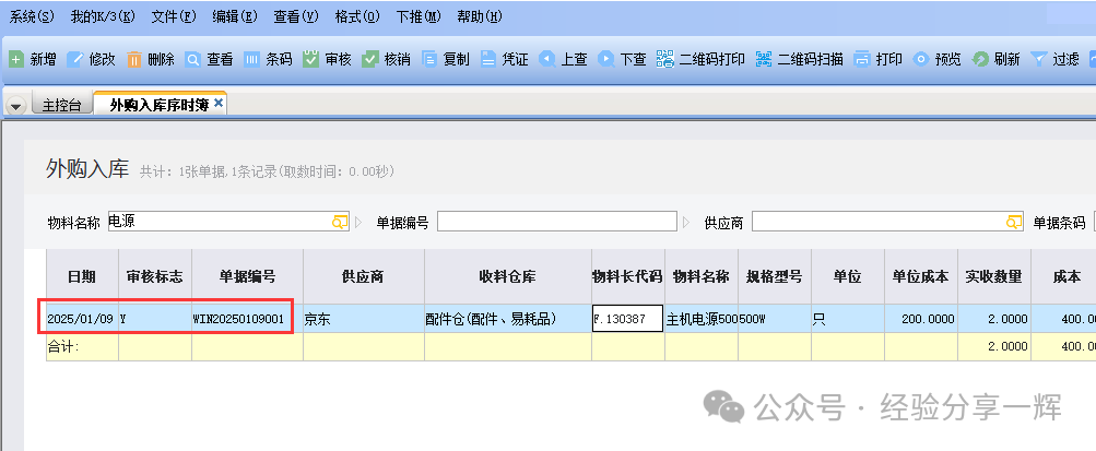 我们再讲一次金蝶的采购流程:录(采购申请单)时,我们要填写(产品信息)。流程到采购订单时,我们要填写(价格)和(供货商信息)。到货后,仓库验货,填写(入库单),没有问题就产品入库存,生成记账发票,结束采购流程。 如果产品有问题,要退货,退货流程:仓库再填一张(红色的入库单),退库存和记账发票,单据回到(采购订单状态),采购重新购买,再走一次入库流程,或者不买了,采购关闭单据,结束采购流程。 注意:金蝶k3系统的单据,分为红字和蓝字,蓝字为正数单据,红字为负数单据。(正常流程是蓝色字单据,退款退货之类的是红色字单据) 退货流程分三部讲解: 01.系统里找到要退货物品的入库单; 02.做红字的外购入库单,退货退发票; 03.不买(关闭单据)或(再次购买)重走入库流程; 还是我们之前的例子:京东,采购两个500W电脑电源,200元/个,现在要做退货处理。 01:找到要退货的采购入库单 打开(采购管理)——(外购入库)——(外购入库单维护)——(过滤条件)——注意(下面的最好选全部,不然有的单据不显示)