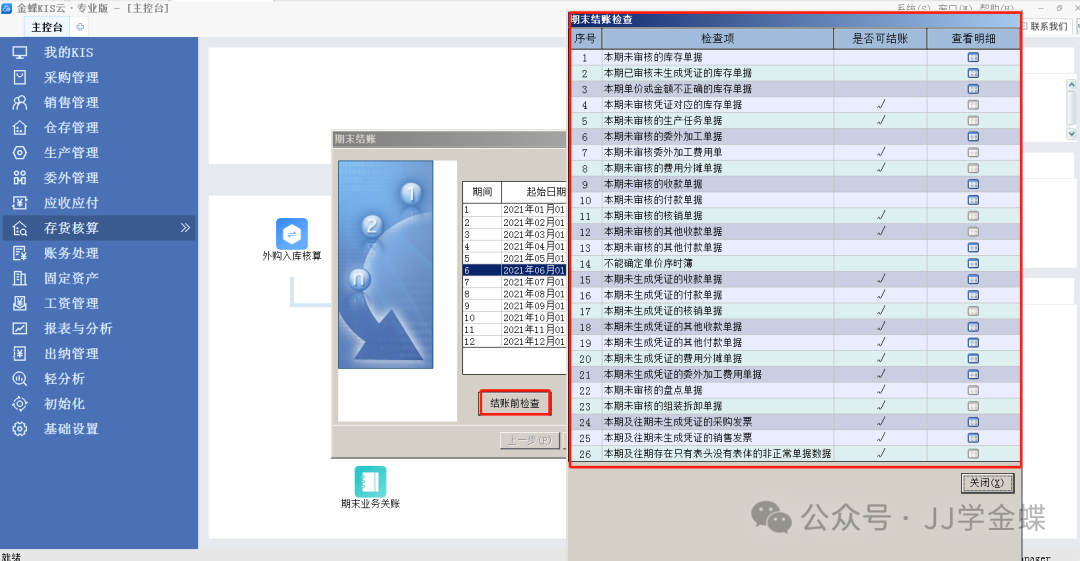 在业务生成凭证处理完毕后,业务系统即可进行结账操作。