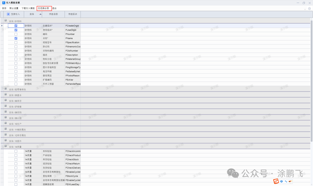 • 个人比较推荐先仅选择必录字段,然后在增加需要导入的业务字段,设置导入模版。