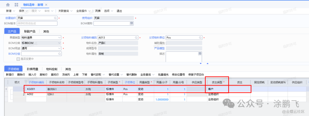 本例已知客供料信息,直接在BOM中设置对应的货主类型,BOM设置如图所示: