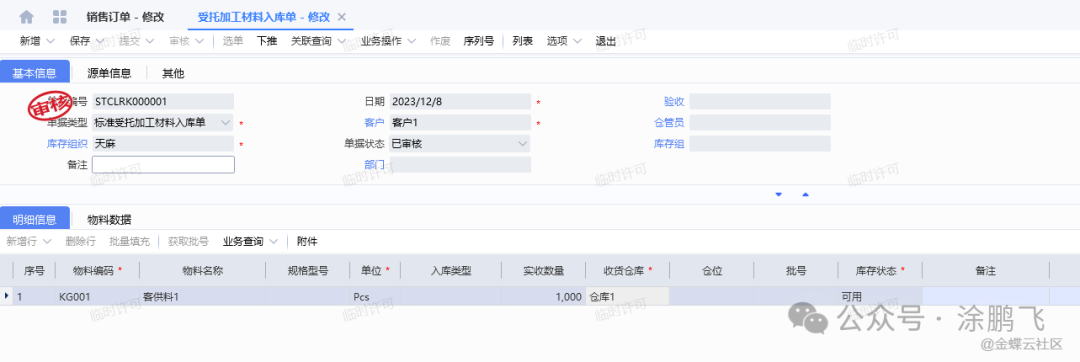 受托加工入库单需要将客户发过来的材料进行入库,货主为客户,仓库可以选择客户仓库,也可选择本公司仓库,该单据因为货主并非本组织,不参与本组织的存货核算及成本计算,该库存仅管理库存数量,无对应成本金额。