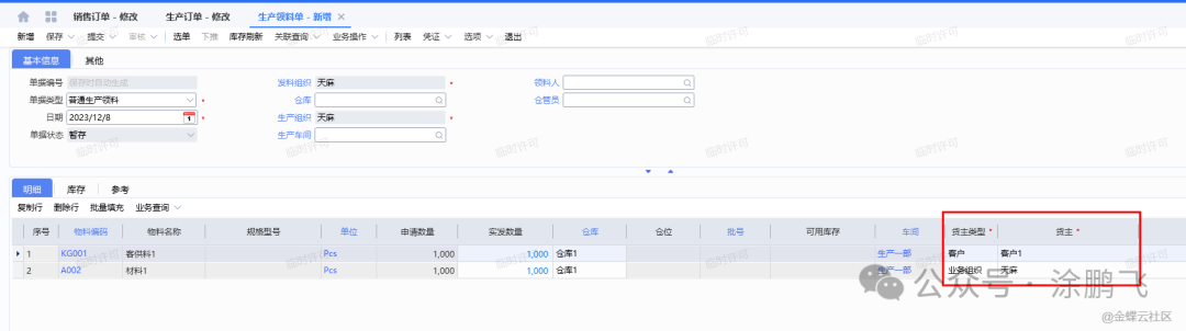 生产领料单可以根据生产订单下推,也可以从生产用料清单下推,生产领料单会显示对应的货主信息,如图所示: