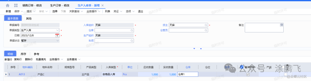 生产完毕之后,进行生产入库,如图所示: