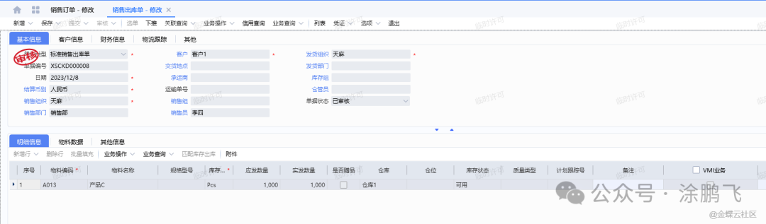 生产完毕之后,通过之前的销售订单下推销售出库单,如图所示: