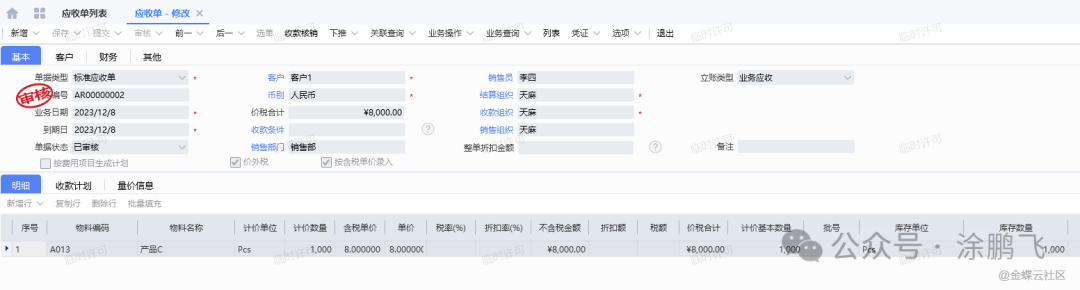 案例:本公司接受客户的委托加工业务,并约定以每件8元的加工费进行结算。仓库接收到客户发给本公司的加工主材料客供料,数量1000pcs。生产车间进行加工材料的生产领料。领料包含客户的客供料,还需领用本公司的库存中的辅料材料。后续完工入库1000pcs产成品C,其中发生人工费若干。加工完成的C产品发出给客户并确认应收款项。