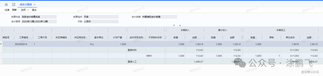 受托加工的流程除了部分材料货主为非本业务组织不需要进行核算之后,生产过程可能领料的其他材料或者辅料以及生成过程发生的工、费等项目均需要进行核算,本例中领用了本组织的材料进行了生产,且发生了工资费用,均需要参与到成本核算中去。在进行存货核算模块的入库核算及出库核算之后,还需进行产品成本核算模块的成本结算,成本计算单结果,如图所示:
