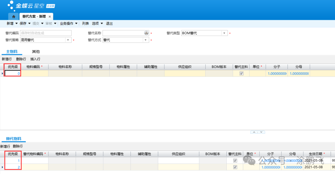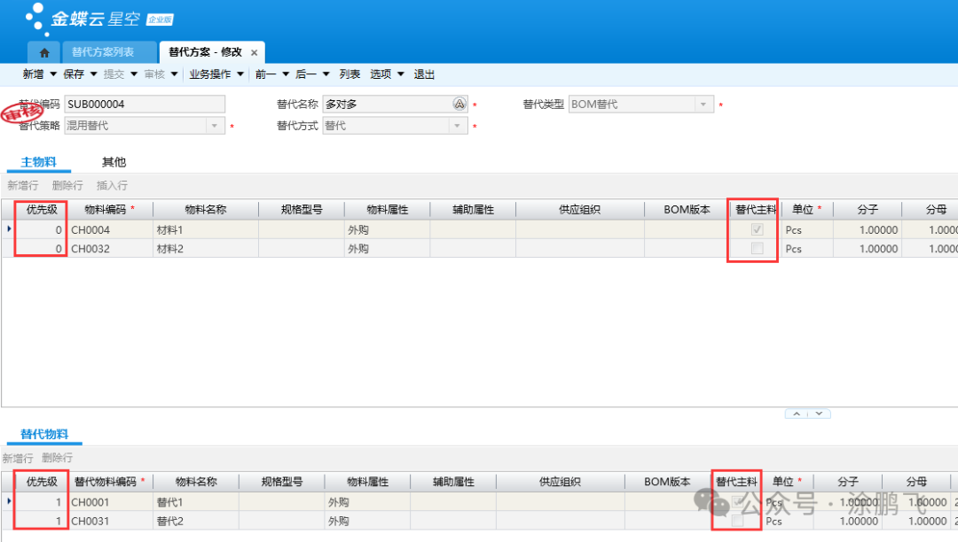 (1) 主物料页签的优先级:一个替代方案,只能对一个或者一组主物料设定替代关系,故主物料的优先级都是同样的。