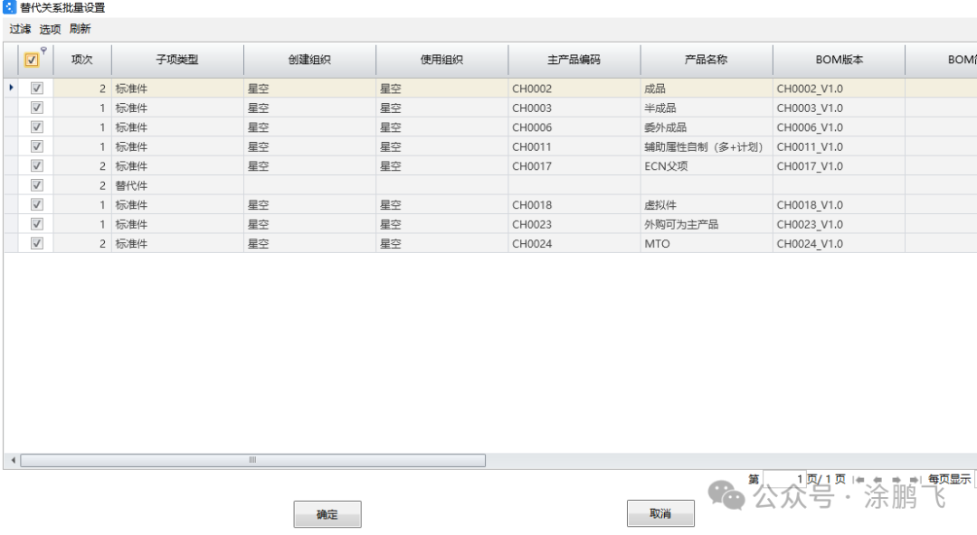 然后在“替代关系批量设置”界面中,勾选需要批量设置的BOM,再点【确定】即可,如下图所示: