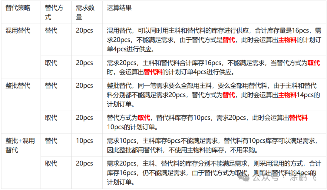 案例背景:主物料库存有6pcs,替代料的库存有10pcs,当设置不同替代策略、不同替代方式时,替代方案和替代策略的参数是组合使用的,得出的结果如下,参考下图。