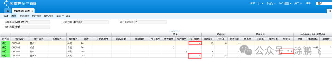 根据本案例,需求数量10pcs,材料1库存6pcs,不能满足需求,由于设置的替代策略是混用替代,所以主料和替代料可以混合使用,需求的10pcs其中的6pcs用材料1供应,剩余4pcs的需求,先查看作为替代主料的替代1的库存是否满足,由于替代1库存有10pcs,可以满足需求,因此不用产生材料1、替代1的计划订单;同时因为替代1和替代2是同时替代材料1,所以替代2的需求数量也是4pcs,库存有8pcs,可以满足需求,不用跑出替代2的计划订单。下图所示。