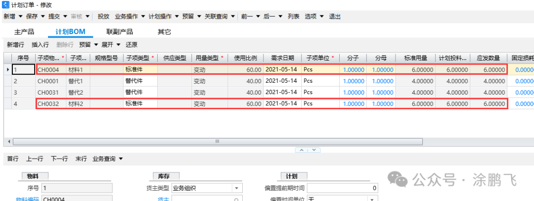 根据本案例,需求10pcs,替代策略为混用替代,作为替代主料的材料1库存有6pcs,因此剩余4pcs的需求要产生替代,作为替代主料的替代1库存有10pcs,可以满足4pcs的需求,所以最终主物料需求6pcs,替代料需求4pcs,由于材料2库存为0pcs,因此需要跑出6pcs的计划订单进行供应。运算后成品的计划BOM如下图所示,其中材料1和材料2的需求是6pcs,替代1和替代2的需求是4pcs。