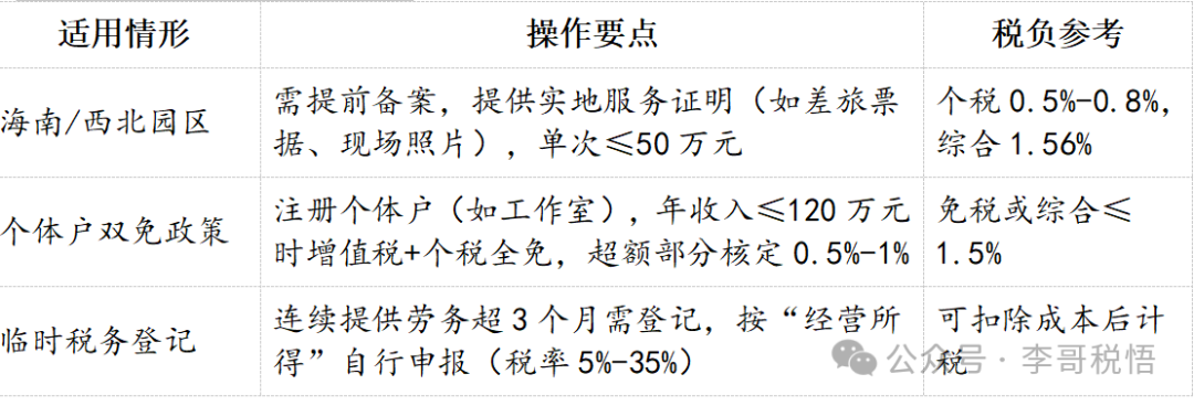示例:单次开票6,000元(不含增值税): 应纳税所得额= 6,000 × (1 - 20%) = 4,800元 预扣个税= 4,800 × 20% = 960元 注意:次年需并入综合所得汇算清缴(税率3%~45%),多退少补。 二、税收优惠政策 1. 小规模纳税人普惠政策 增值税减按1%、附加税减半、月销售额≤10万免教育附加等政策持续至2027年。 2. 税收园区核定征收(合规降低税负) (1)政策收紧现状 截至2025年6月,全国范围内自然人代开核定征收政策已大幅收紧,主要表现为: 全面清理违规园区:2024年起税务总局开展专项整治,15省份(如江苏、湖北等)已全面取消核定征收,仅海南、西北等少数地区保留,且门槛提高(如年累计开票额≤120万元); 业务真实性审查强化:需提供完整证据链(合同、物流/服务记录、资金流水、第三方平台交付证明),且禁止跨省代开(必须在业务发生地或户籍地办理); 行业限制:建筑、医药、股权转让等敏感行业基本禁止核定,仅限技术服务、设计咨询等低风险领域。 (2)仍可操作的合规路径