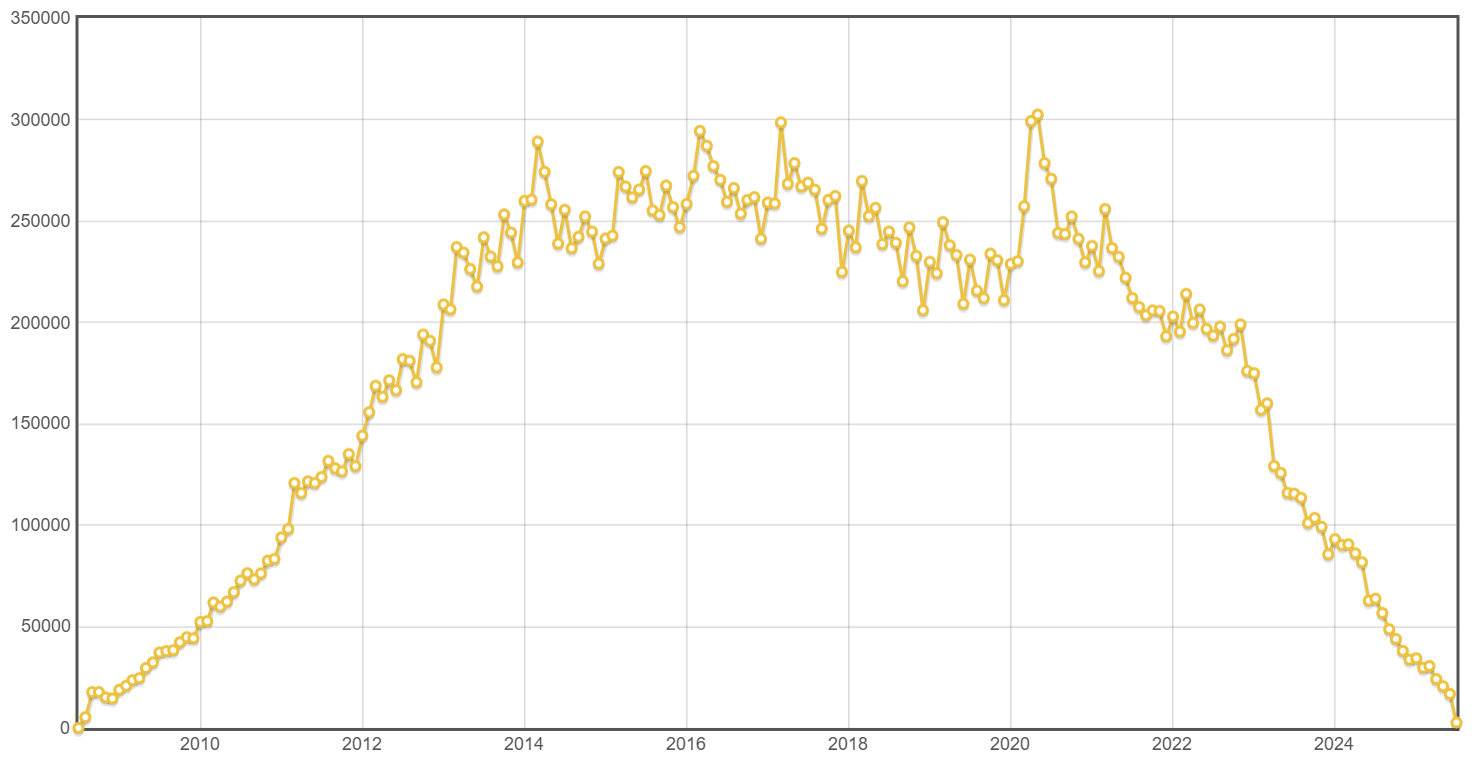 原标题:Stack Overflow,轰然倒下! 你好呀,我是歪歪。 前几天看到一个让我感慨万千的走势图: ![]() 本来想让你猜一猜这个走势图的内容是什么的。 但是结合标题你应该也能猜到了,和 Stack Overflow 有关。 这个走势图的数据是 Stack Overflow 从 2008 年开始到现在,每个月新问题的个数。 数据的来源是这个网站: