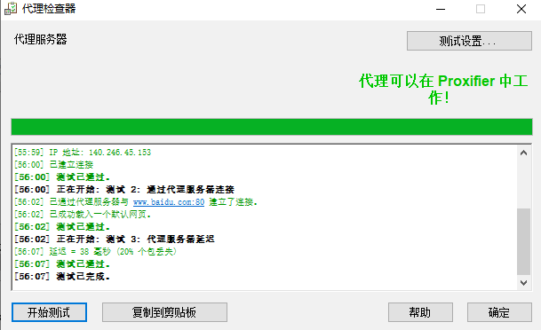 4) 在弹出的“代理服务器”对话框中,输入代理服务器的IP地址和端口,选中“HTTPS”或者"socks 5"单选按钮(具体是HTTPS还是SOCKS 5视业务要求而定),再单击“确定”按钮。如下图,假设用户购买了长效IP 140.246.45.153,端口3828 ( 实战中换成您实际购买的长效IP和端口,或者是隧道代理地址和端口也可,其中隧道代理还具备定时切换和按请求转发切换的超能力哦!),如果有用户名密码也填上。(特别注意:如果是隧道代理使用白名单验证和使用用户名密码验证 端口号是不同的,具体参见购买的隧道代理的详情页面)。5) 在“代理服务器”对话框中,单击“检查”按钮。6) 在弹出“代理检查器”对话框中点击“开始测试”,将显示测试信息。绿色代表测试通过!1) 在Proxifier的“配置文件”菜单上,单击“代理规则”选项。