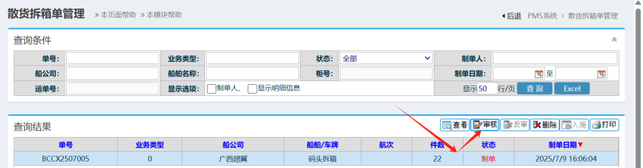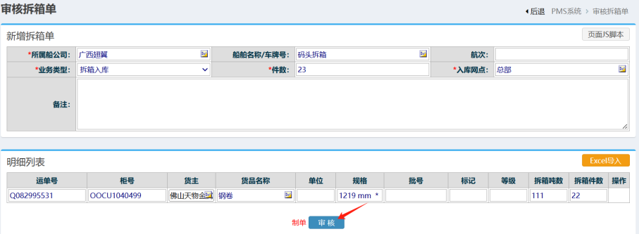 :点晴PMS-审核拆箱单功能-操作流程![]() 1.拆箱单管理-点击进入 如下图: 2.进入界面后,选择对应的单据,点击审核按钮, 如下图所示: 3. 进入界面后,核对清单,点击“审核”按钮, 如下图所示:
