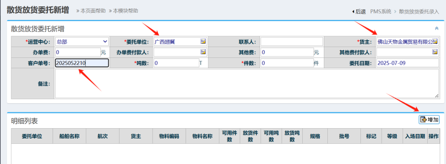 2.进入界面后,依次选择委托单位,货主,录入客户单号,点击增加按钮