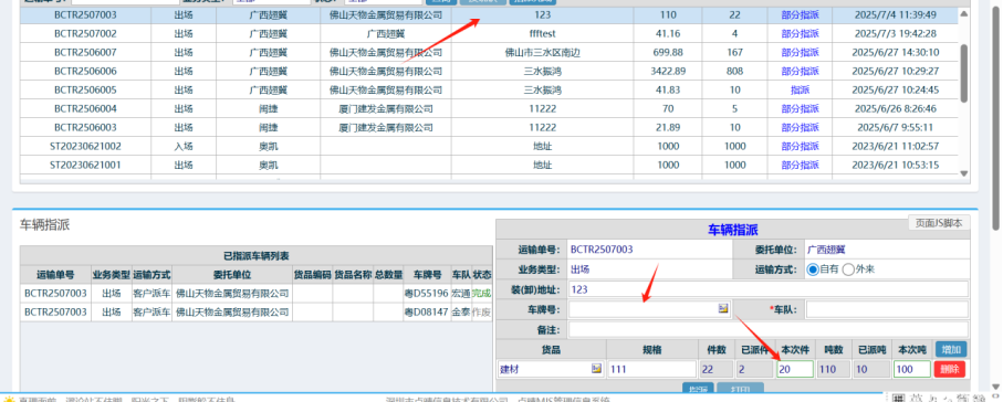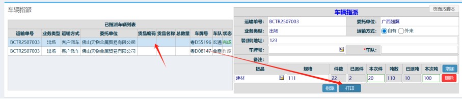 2.进入界面后,选择对应的运输单,指派对应车牌号,录入派车的件数,点击指派按钮 如下图所示: