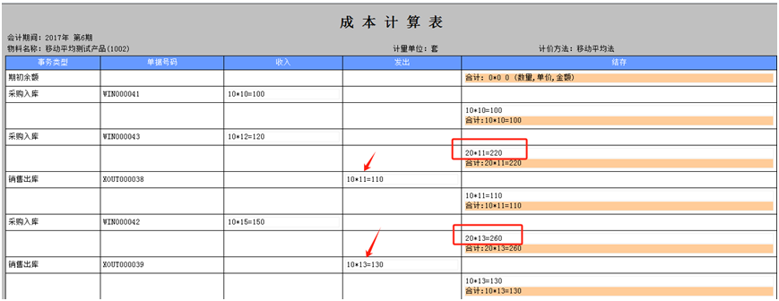 2.移动平均法: 2.1 计算方法:本次出库日期前的结存金额/本次出库日期前的结存数量 2.2 计算结果:6.5号的出库成本:(100+120)/(10+10) =11 6.15号的出库成本:(110+150)/(10+10)=13
