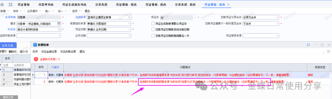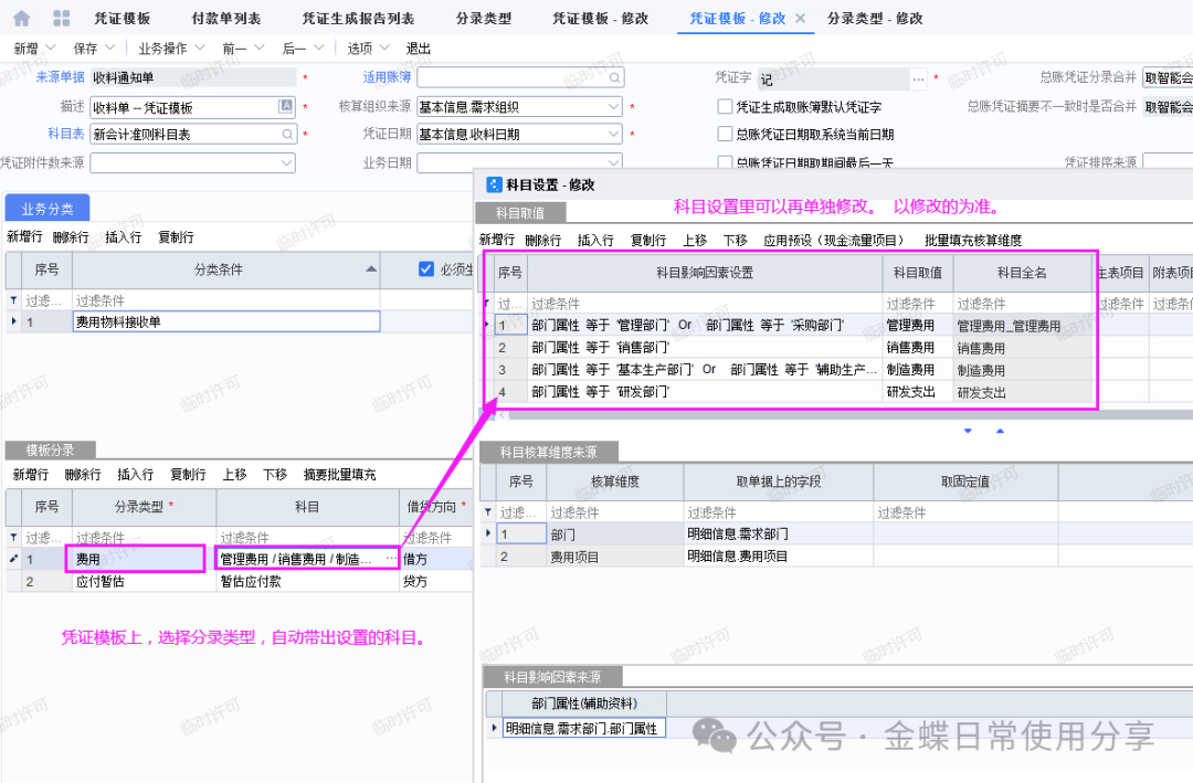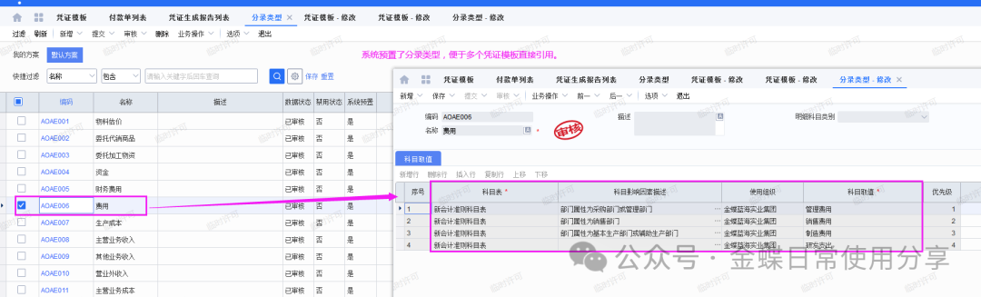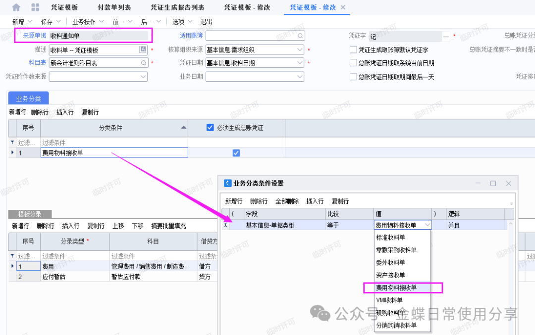 2、业务分类 ① 可以理解为对单据的业务细分,不同的业务分类可以设置不同的模板分录。单据上的表头字段均可以作为业务分类的判断依据(注意不仅仅是单据类型字段)。通过业务分类,可以覆盖一种来源单据承载的多种应用场景。 ② 举例说明:应付单有两个单据类型——标准应付和费用应付,两种单据类型账务处理不同,那么在设置凭证模板时应该设置两个业务分类,一个业务分类的单据类型=标准应付,一个业务分类的单据类型=费用应付,两个业务分类所对应的模板分录是不同的。单据生成凭证时系统会自动判断满足哪个业务分类从而生成对应的分录。