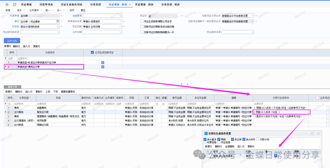 3、分录行生成条件 ① 可以理解为生成该行分录的前提条件;为空则表示无条件生成;单据上的所有字段均可以作为分录行生成条件的判断依据。 ② 举例说明:应付单——费用应付单分录上有个【计入成本】复选框,是否计入成本在账务处理时要求进不同的科目,计入成本冲减应付暂估科目,不计入成本则进费用科目;那么在设置凭证模板时就应该这么设置:一条分录的借应付暂估,分录行生成条件是计入成本,另一条分录是借费用,分录行生成条件是不计入成本。单据生成凭证是系统会自动判断满足哪个分录行生成条件从而生成对应的分录。