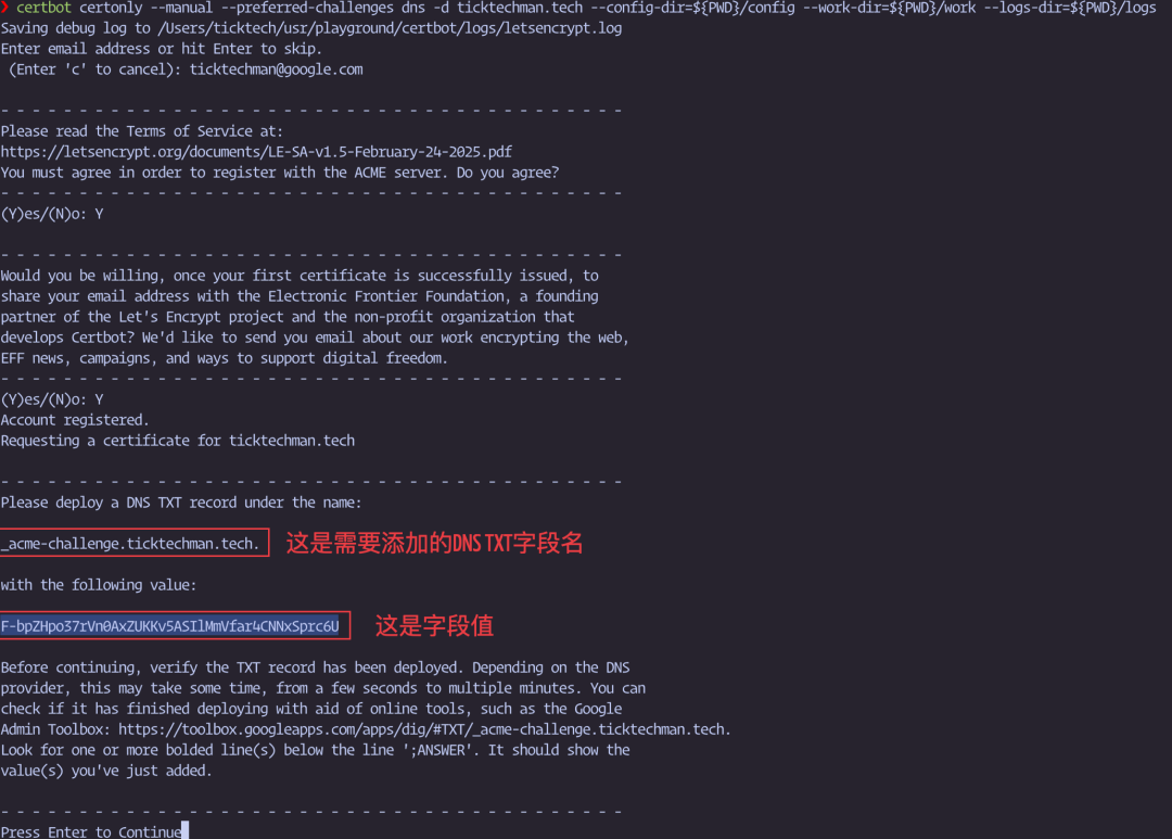 在申请证书的过程中,cbot需要验证域名的所有权是否属于你,提供了三种方式:在我们的场景中,网站还不存在,因此选择通过DNS-01的方式来验证域名归属权。执行下面的命令:mkdir certbot && cd certbotmkdir config logs workcertbot certonly --manual --preferred-challenges dns -d ticktechman.tech --config-dir=${PWD}/config --work-dir=${PWD}/work --logs-dir=${PWD}/logs