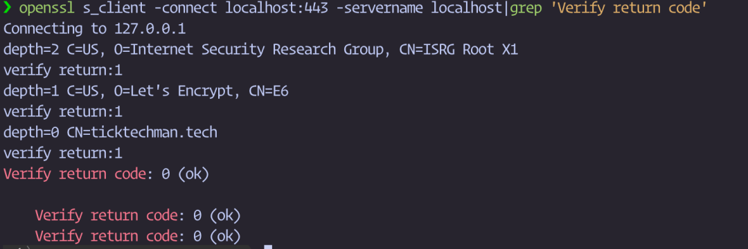 然后重启或者重新加载nginx配置,可以使用下面的命令来验证证书合法性:nginx -s reloadopenssl s_client -connect localhost:443 -servername localhost|grep 'Verify return code'