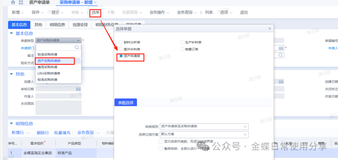【操作说明】:当需求人员做了资产申请单的情况下,首先调整采购申请单的单据类型为资产采购申请单,再通过选单的方式创建采购申请单,选择采购组织、录入推荐供应商(可选)提交审核。