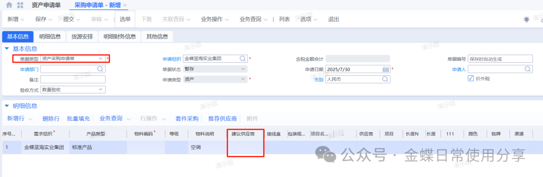若需求人员不做资产申请单,可以直接创建采购申请单来达到申请的需要,单据类型为资产采购申请单,手动填写资产申请组织及部门、采购组织、物料、数量、到货日期、及建议供应商(可选)并提交审核。