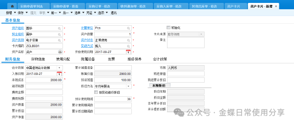 若还有附属设备、发票内容、维修保养需要记录,都可以放在附属设备、发票、维护保养页签中,此处仅作为管理需求存在,不影响财务计算。