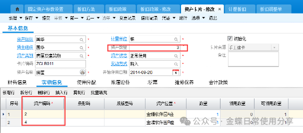 若资产卡片存在一卡多物(同一种物料多数量)的状况,则在实物信息页签中,可以通过资产编码区分不同的实物资产,一般一个资产编码一个实物资产,每个资产编码对应资产位置及数量。
