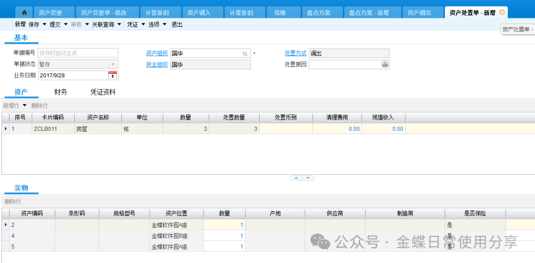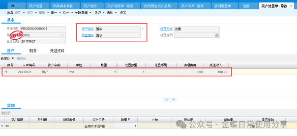 【操作说明】:当用户需要对固定资产进行出售等处置处理时,新增资产处置单,选择资产组织及货主组织,选择卡片编码,填入所需费用及得到的收入,确定实物分录,并进行提交、审核操作。