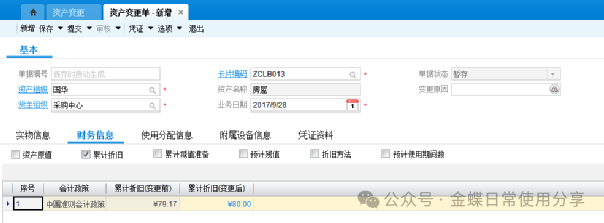 注:当资产做非财务变更不需要做新的折旧计提,当资产财务变更的情况下需要做折旧计提(计提方法看第四章 1.固定资产折旧计提)