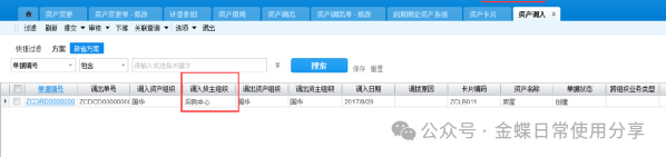 如果在资产调入列表中没有看到单据,查看所在组织是否是调入货主组织,选择单据提交审核。