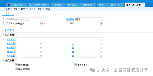 【功能菜单】:资产管理】->【固定资产】->【资产盘点】->【盘点方案】