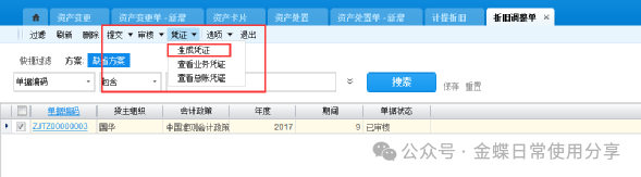 选择需要生成凭证的单据,点击“生成凭证”,生成计提折旧凭证,还可以通过列表中查询单据的业务凭证及总账凭证。