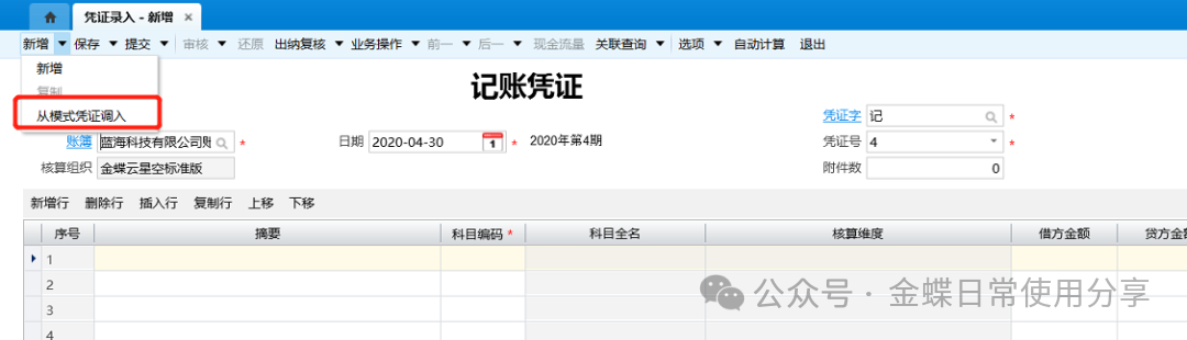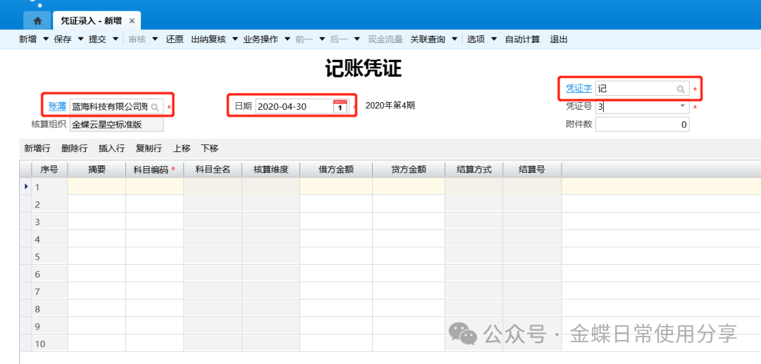 在凭证录入页面选择需要录入凭证的账簿、日期以及凭证字;