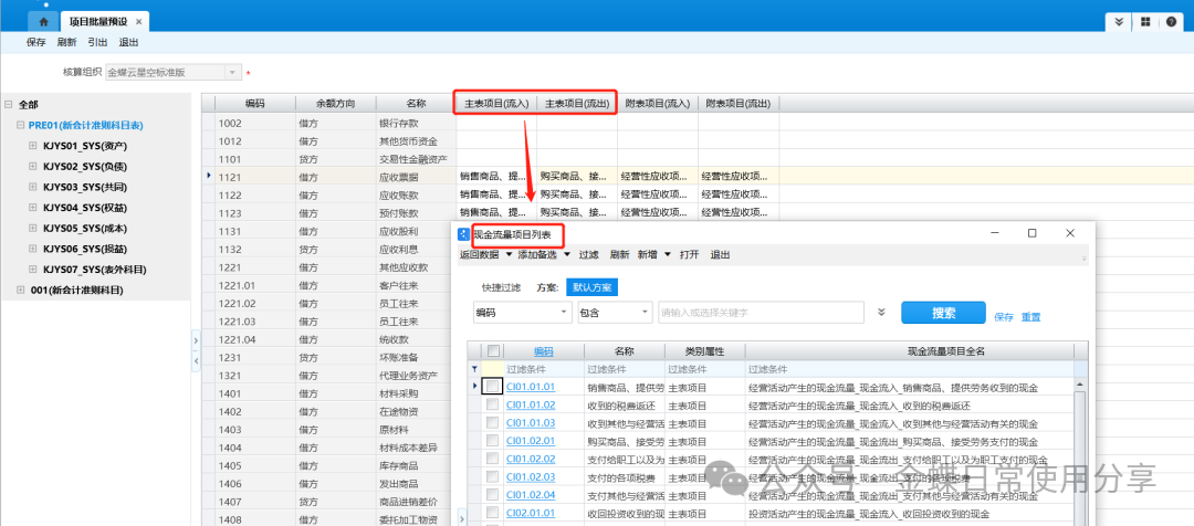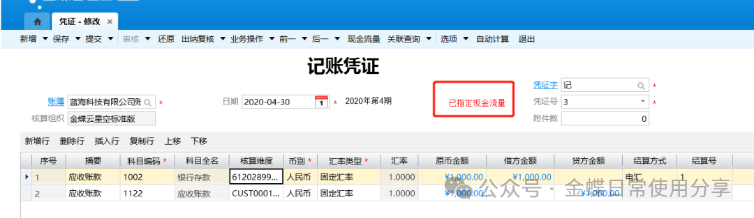 6.点击【现金流量】,在弹出的【现金流量项目指定】框中点击【自动指定】按钮,系统会根据凭证分录的业务分类自动拆分并匹配现金流量科目以及其对方科目,用户也可手工调整;(如果某个会计科目的现金流量项目相对固定,建议在科目中预设其现金流量项目,这样在凭证指定流量项目时,系统可以根据科目预设信息默认携带对应的现金流量项目到现金流量指定界面中,无需再手工选择,参照现金流量相关处理);指定成功后,凭证会红字显示“已指定现金流量”