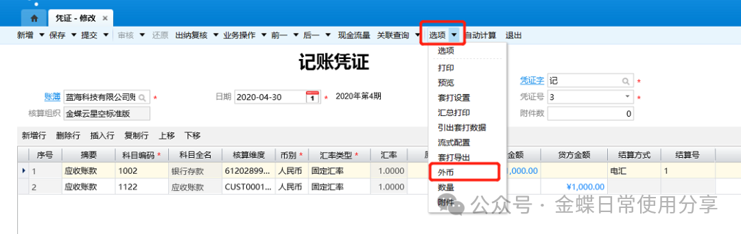 选中此项,凭证保存时系统将检查外币分录的原币金额乘以汇率是否等于本位币。如果不平衡,系统不予以保存凭证