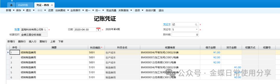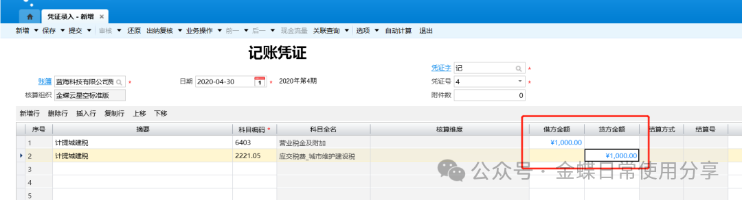 4.录入科目对应的借方或贷方金额。若已有一方金额,鼠标定格在另一方金额的单元格中,点击【自动计算】,根据借贷平衡原理,系统会自动计算出另一方的金额;