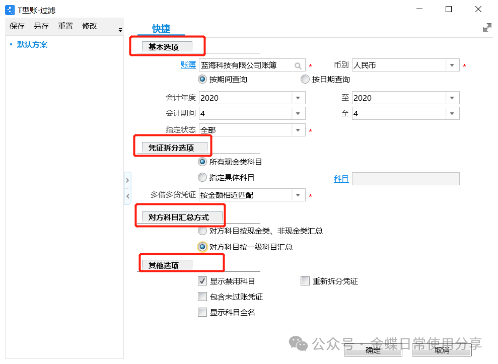 1.用户第一次进入多栏式明细账需新增“多栏式方案”,可根据实际情况设置多栏式明细账的格式,包括账簿、查询类型以及查询项目等;
