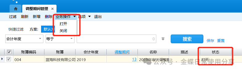业务场景】:调整期间管理用来维护各账簿的调整期间,支持调整期间的新增、复制、修改、删除、打开、关闭等操作。