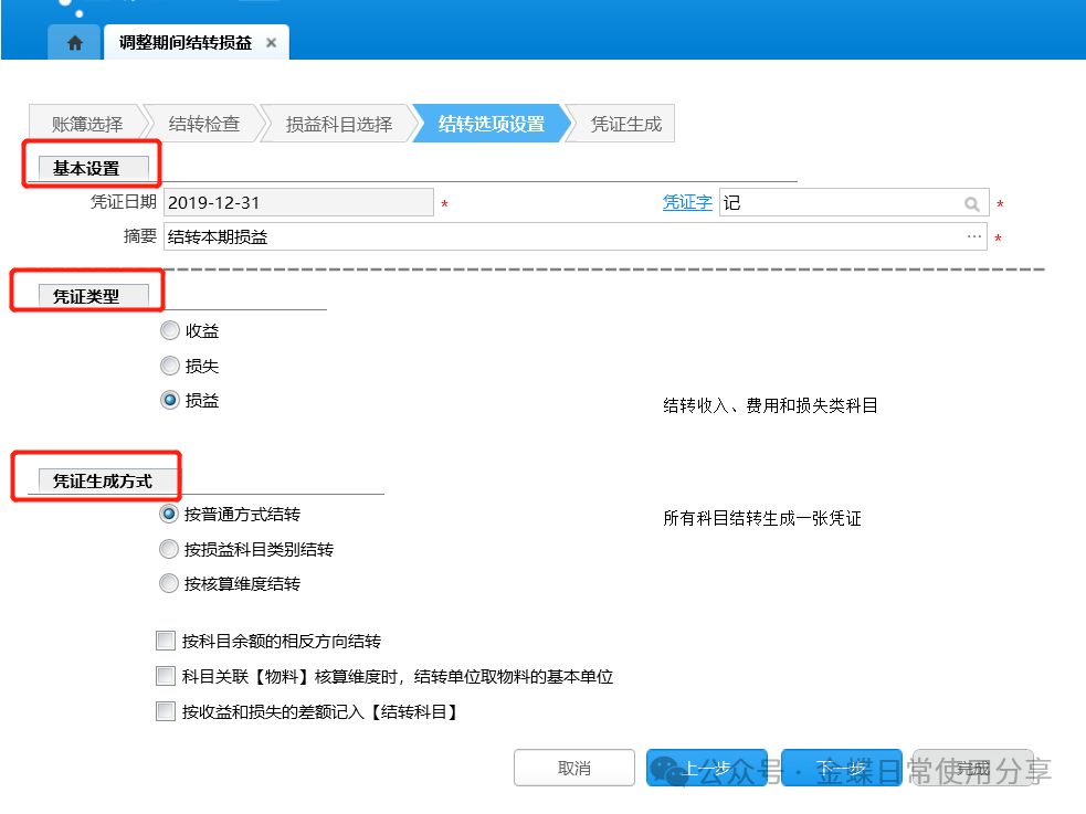 1.账簿选择:选择账簿、调整期间,点击【下一步】,结转损益界面的调整期间下拉列表显示账簿在当前会计期间之前所有未关闭的调整期间;