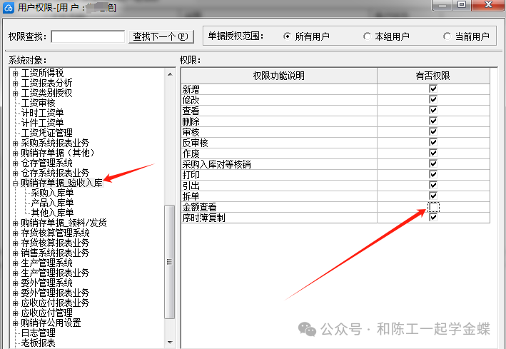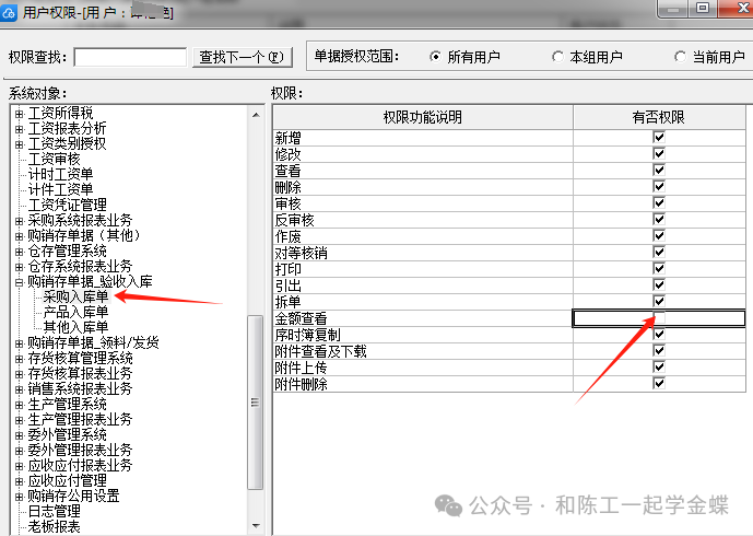 其实这只是你以为的取消而已,其实我们需要在上面的购销存单据-验收入库里面也要取消,你只取消它下面的,不取消它自己,那是没用的,应该在这里也要取消,这个问题是特别多客户问到的,就算把下面的采购入库产品入库其它入库全部取消,只要上面的购销存单据-验收入库没取消,他还是会拥有所有的权限。