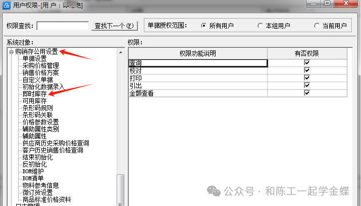 即时库存的权限在购销存公用设置里面,这里还有其它很多权限,比如单据设置,BOM录入等。