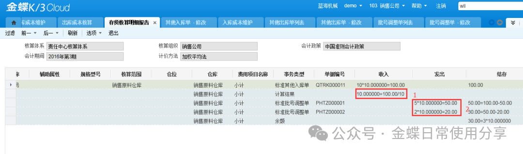 通过这个案例我们可以看出,A、C仓库核算调拨单出库成本时计算逻辑与正常业务不一致,主要原因A、C仓库存货核算时部分业务单据存在嵌套。系统计算时先找到嵌套源头,第一次出库成本核算时不包含嵌套单据收入直接计算嵌套单据出库成本,第二次计算时加入嵌套单据收入计算存货出库成本并更新其他业务单据的出库成本;针对嵌套结束单据系统第一次计算时如果物料存在期初或其他非嵌套业务单据的收入,系统以这两种业务的收入按存货核算方法计算嵌套业务单据的出库成本,如果当期没有期初或其他非嵌套业务单据系统取本期嵌套业务单据的收入,计算嵌套业务单据的出库成本。