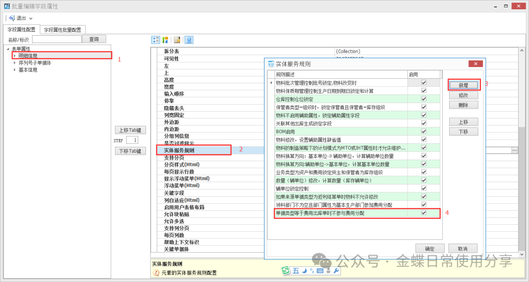 2.打开BOS新增“其他出库单”“明细信息”的“实体服务规则”,我这里新增“单据类型等于费用出库单时不参与费用分配”实体服务规则。