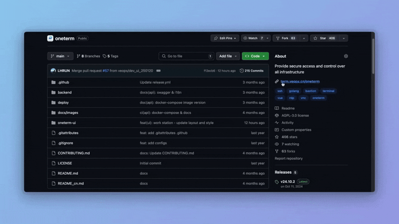 前言在当今数字化时代,企业面临着日益复杂的网络安全威胁与严格的合规性要求。为确保系统安全、防范潜在风险,一款简单、轻量且灵活的企业级堡垒机显得尤为重要。OneTerm 作为一款开源的企业级堡垒机解决方案,基于4A(认证、授权、账号、审计)合规标准精心打造,旨在为企业提供集中、安全的系统访问控制与审计功能,助力企业轻松应对安全挑战,满足合规性需求。 项目介绍OneTerm 是一款简单、轻量、灵活的企业级堡垒机,基于4A(Authen认证、Authorize授权、Account账号、Audit审计)合规标准设计和开发。它通过严格的访问控制和监控功能,确保系统的安全性和合规性。