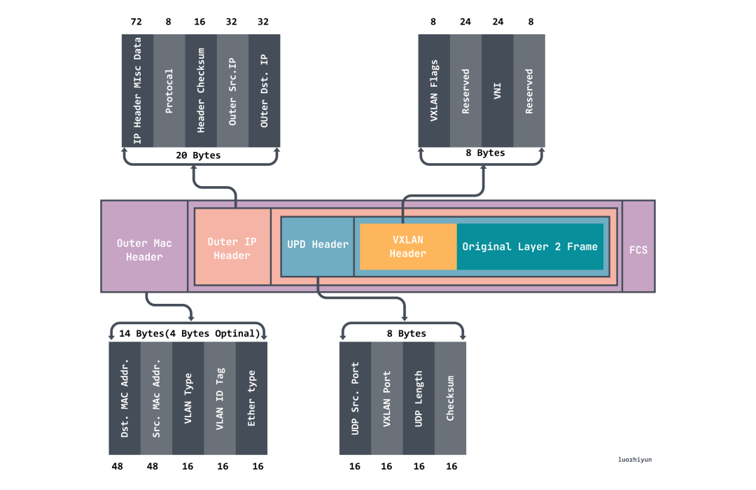 VXLAN网络标识符(VNI)VNI是VXLAN网络的标识符,每个虚拟网络都分配一个唯一的VNI,用于区分不同的虚拟网络。VNI长度为24位,可以支持多达1600万个虚拟网络,这远远超过了传统VLAN的4096个ID限制。 VXLAN隧道与封装VXLAN的工作原理基于隧道技术,将二层以太网帧封装在UDP报文中,通过IP网络进行传输。 VXLAN报文的结构如下: