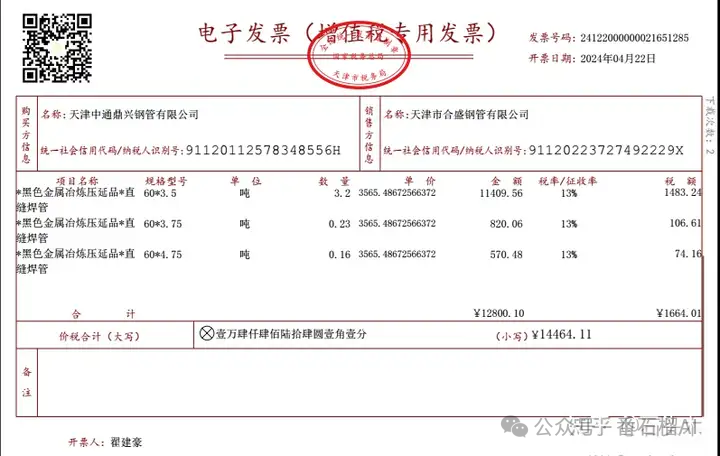 { "msgCode": 200, "msg": "返回成功!", "code": null, "number": "24122000000021651285", "date": "2024年04月22日", "checksum": null, "totalAmount": 14464.11, "totalAmountString": "壹万肆仟肆佰陆拾肆圆壹角壹分", "taxAmount": 1664.01, "amount": 12800.10, "buyerName": "天津中通鼎兴钢管有限公司", "buyerCode": "91120112578348556H", "buyerAddress": null, "buyerAccount": null, "sellerName": "天津市合盛钢管有限公司", "sellerCode": "91120223727492229X", "sellerAddress": null, "sellerAccount": null, "type": "增值税专用发票", "detailList": [ { "name": "*黑色金属冶炼压延品*直缝焊管", "model": "60*3.5", "unit": "吨", "count": 3.2, "price": 3565.48672566372, "amount": 11409.56, "taxRate": 0.13, "taxAmount": 1483.24 }, { "name": "*黑色金属冶炼压延品*直缝焊管", "model": "60*3.75", "unit": "吨", "count": 0.23, "price": 3565.48672566372, "amount": 820.06, "taxRate": 0.13, "taxAmount": 106.61 }, { "name": "*黑色金属冶炼压延品*直缝焊管", "model": "60*4.75", "unit": "吨", "count": 0.16, "price": 3565.48672566372, "amount": 570.48, "taxRate": 0.13, "taxAmount": 74.16 } ]}